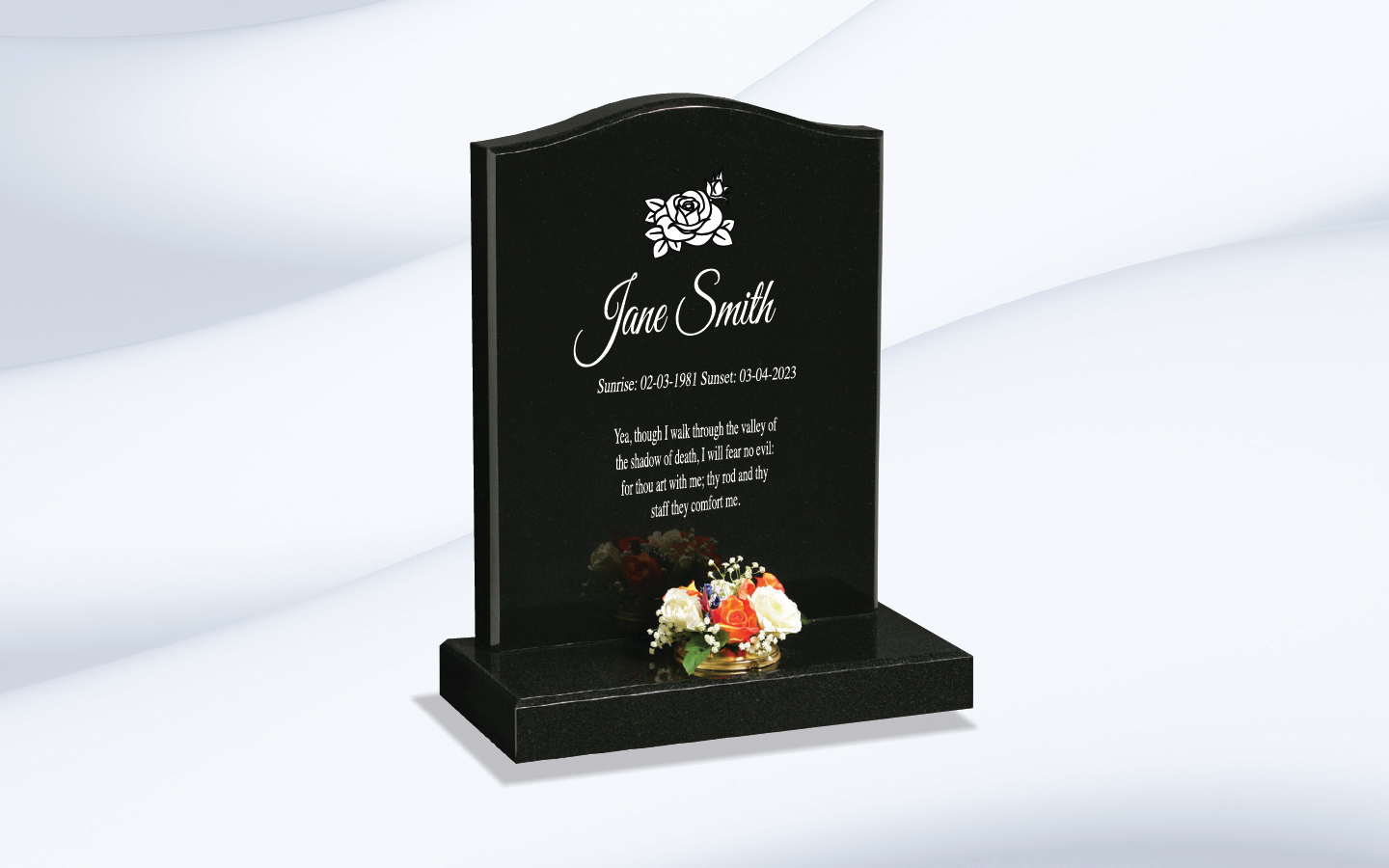The Issa Negro Curved Headstone combines polished black marble with graceful curved lines, offering an elegant presence in any cemetery.
